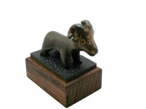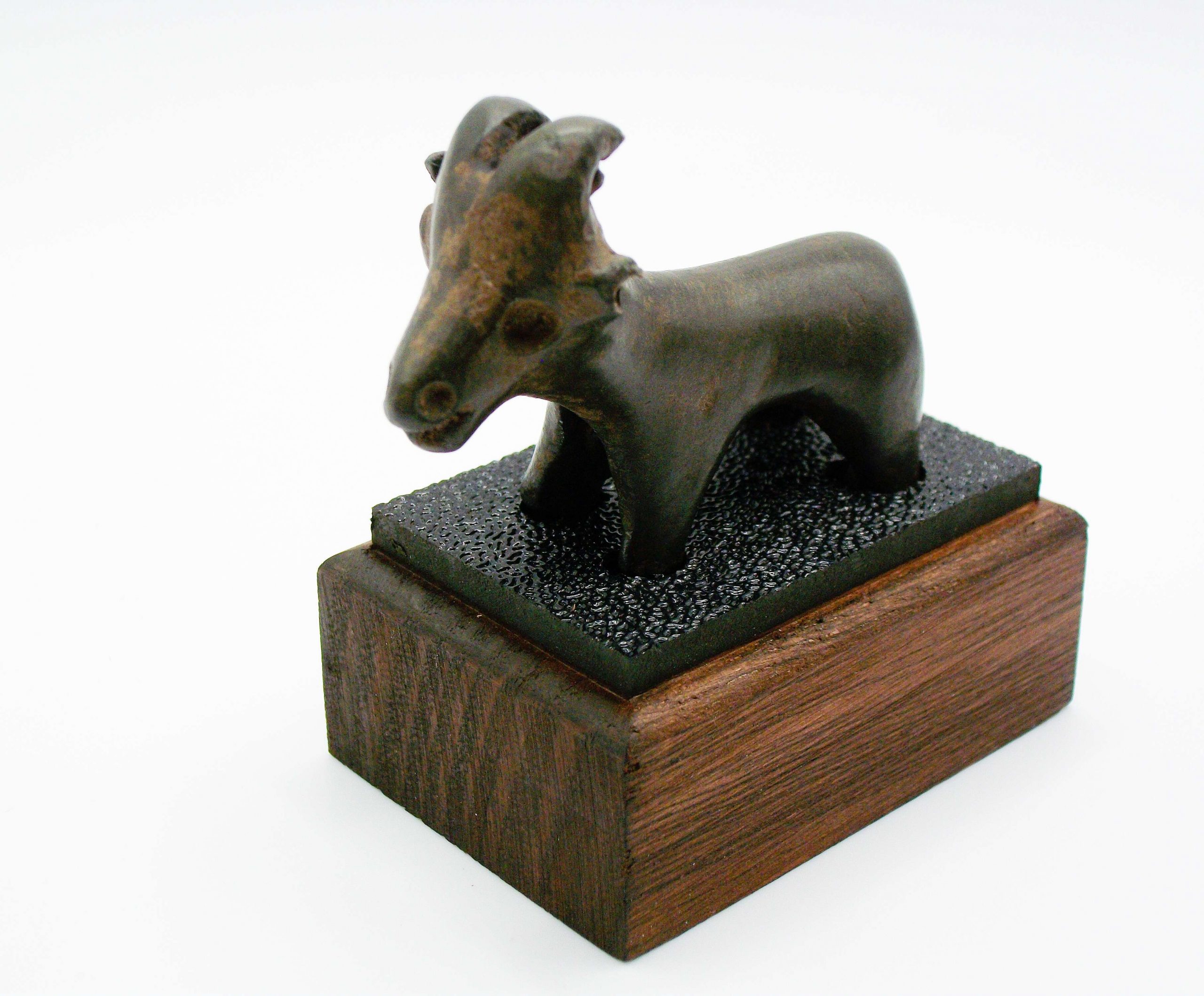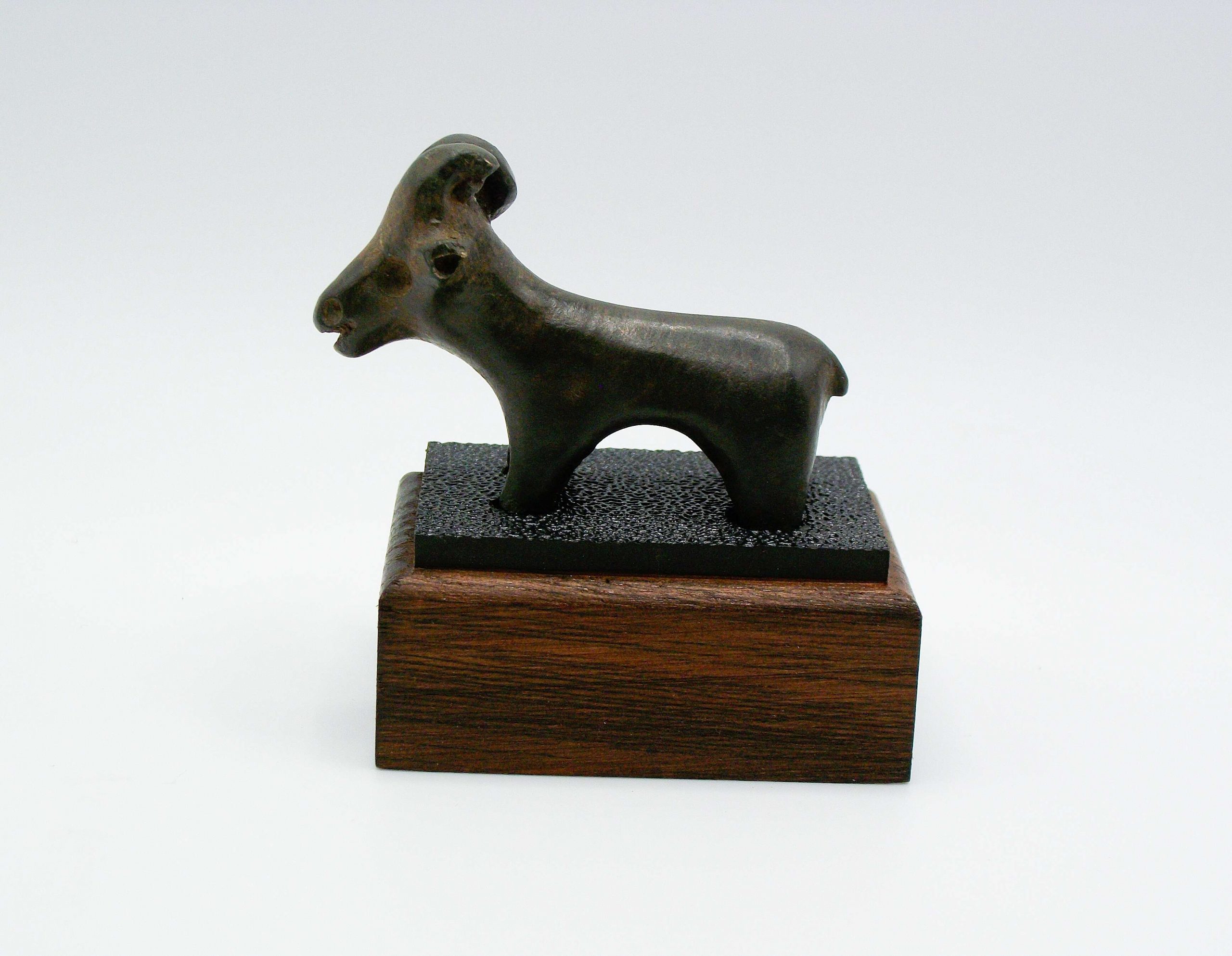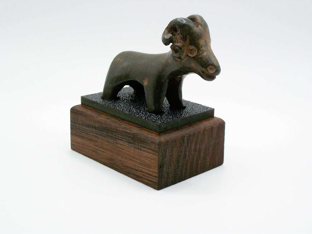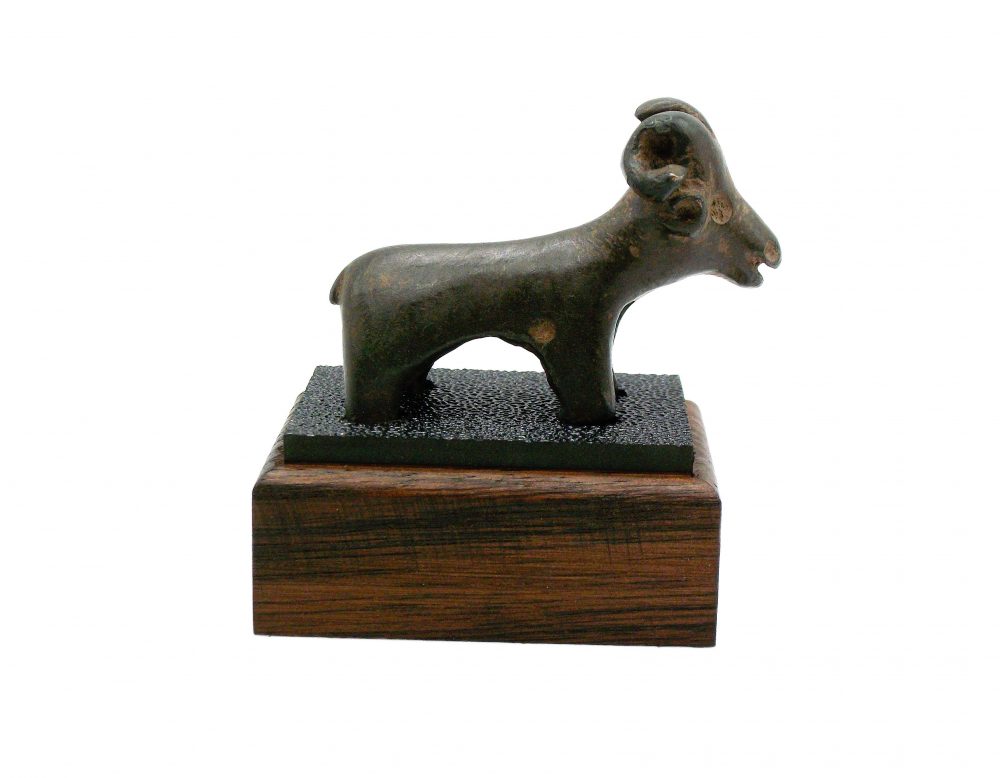 Amlash Culture bronze Ram on a custom made timber and Perspex stand. Curled horns and facial detail impressed into face