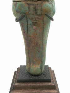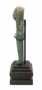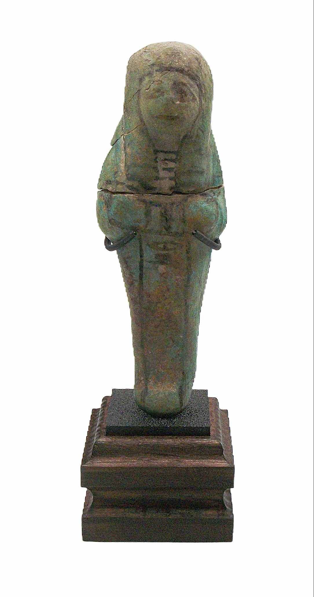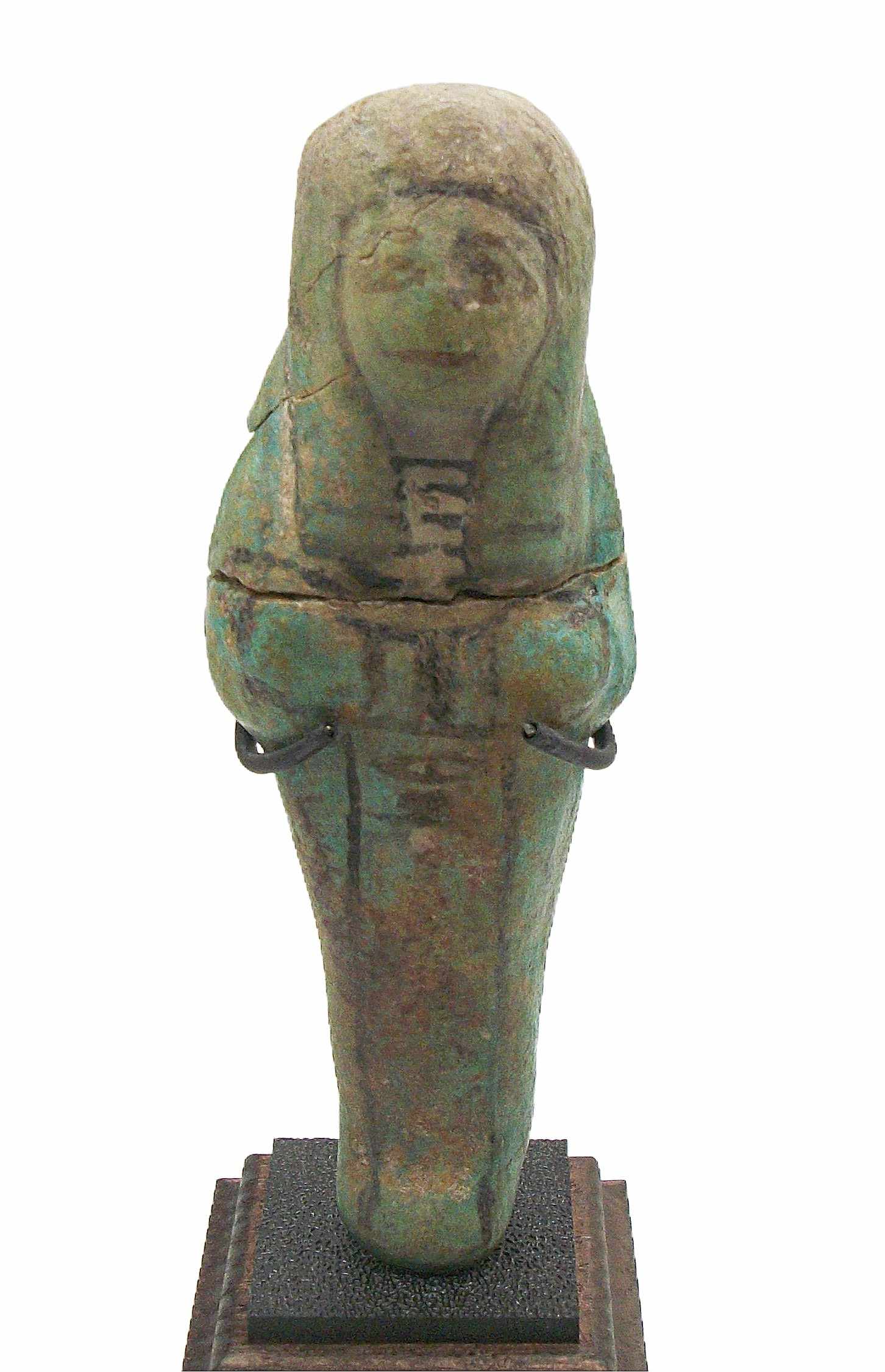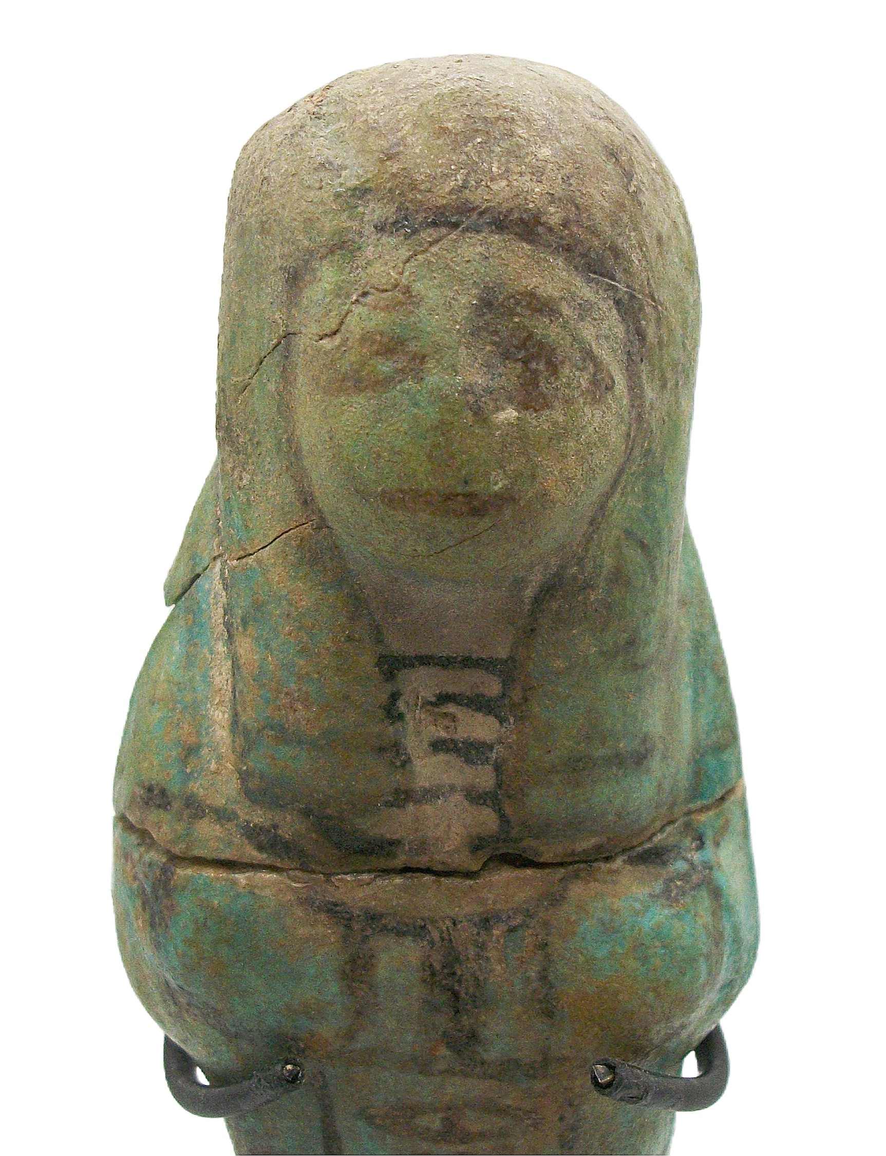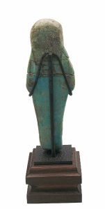 Large size Turquoise blue faience shabti New Kingdom 19th to 20th Dynasty. Rounded front with a flat back. Wearing a tripartite wig, with crossed arms and holding a hoe in each hand, cords for a water pot hanging from back of each shoulder. A seed bag suspended below the wig. Detailing with the eyes, eyebrows, mouth etc outlined in black. The hieroglyph partially reads “The Osiris…..” Old repair to upper body areas. Cf. The Shabti Collections by Glenn Janes, A selection from the World Museum, Liverpool. Museum No. 1.8.79.14 Pg 102