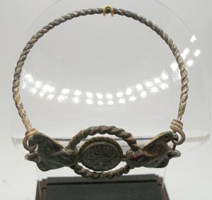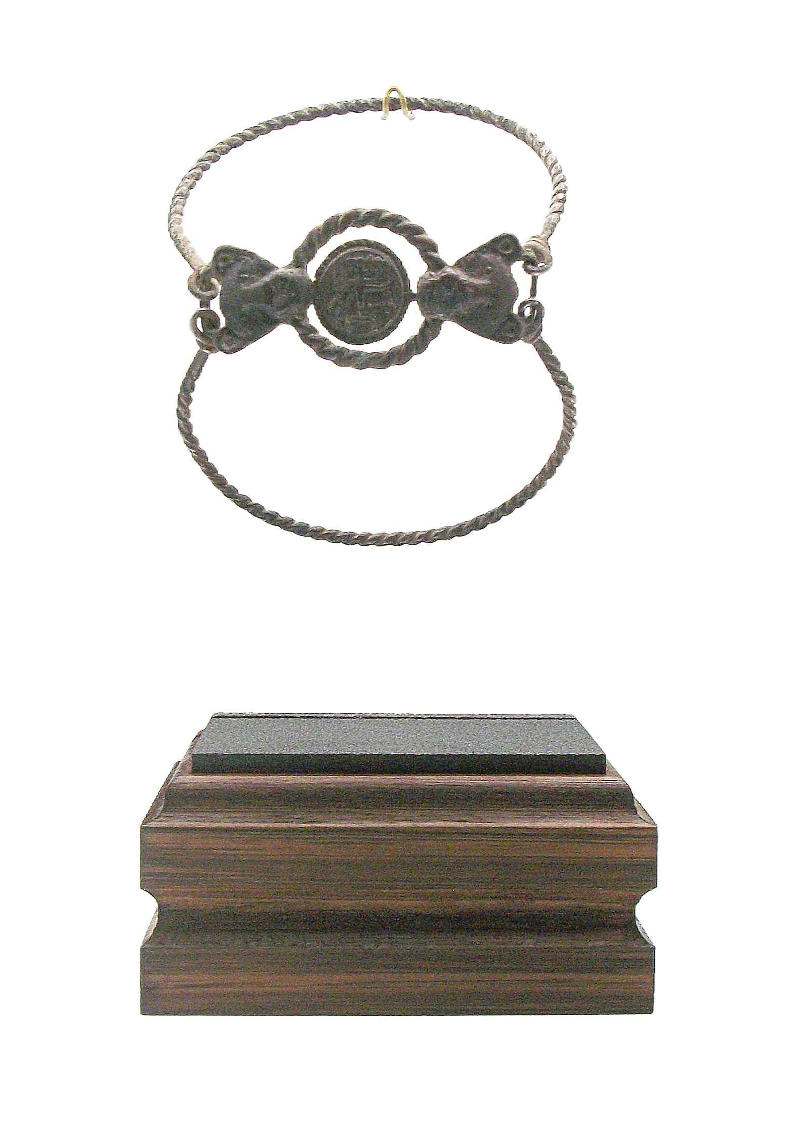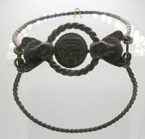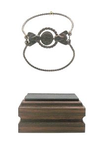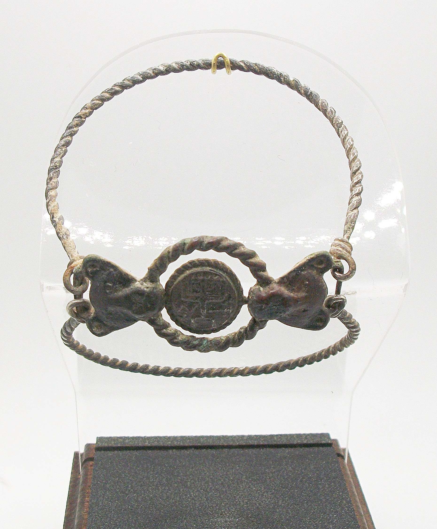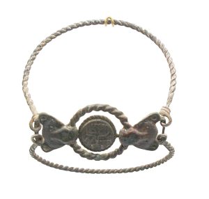 A lovely Judean Silver Bracelet with two decoratively twisted hoops, and facing Lion Head Terminals, supporting a central bezel. The central bezel is bifacial with a Menorah on both sides. An articulate join between the hoops and animal heads. One of the earliest and most famous images of the Menorah is on the Arch of Titus, Rome built to commemorate his triumphal parade following the destruction of Jerusalem in 70 CE.