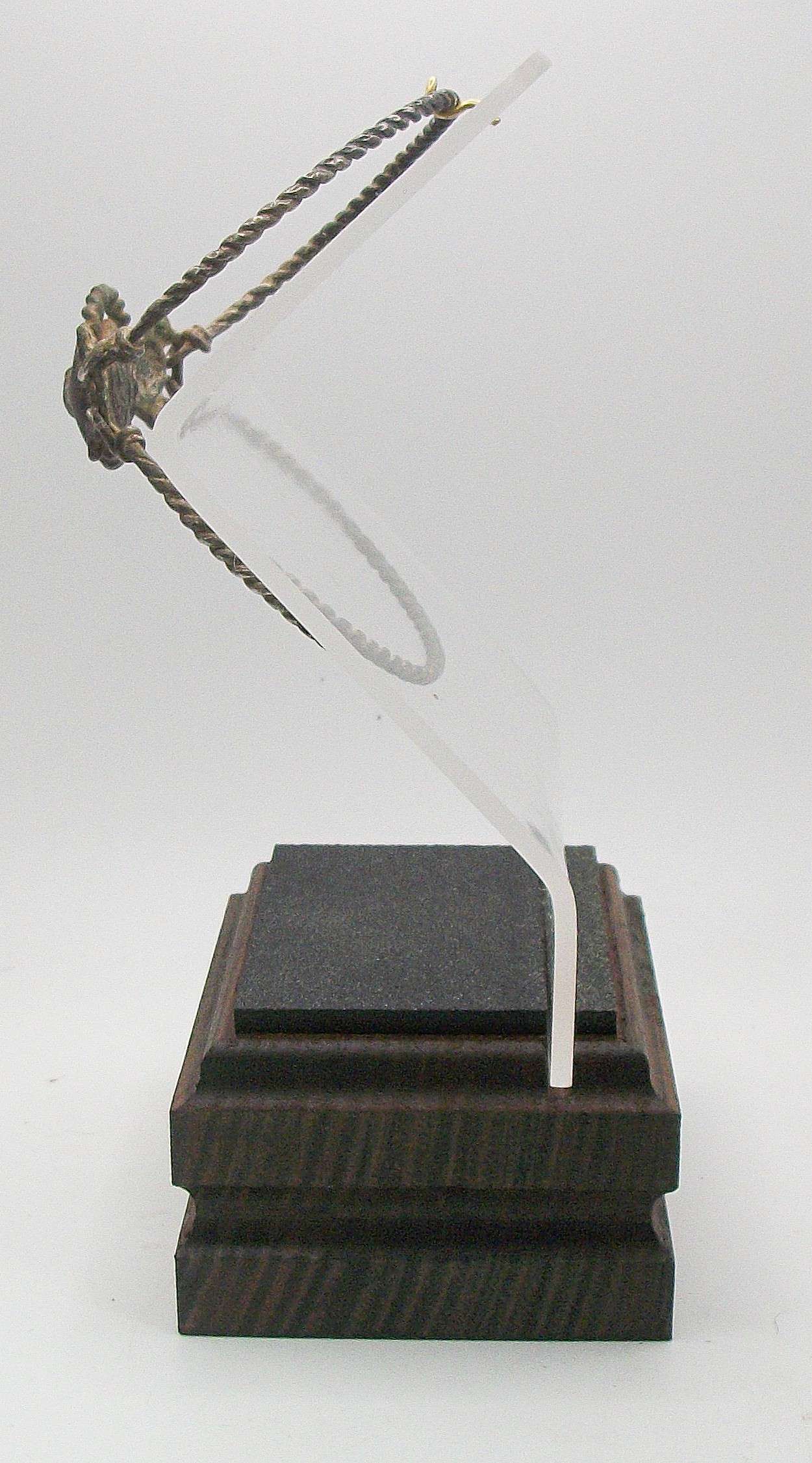 The bracelet is displayed open and is 15cm in this form. Width 7 cm. Height on stand 17.5cm.