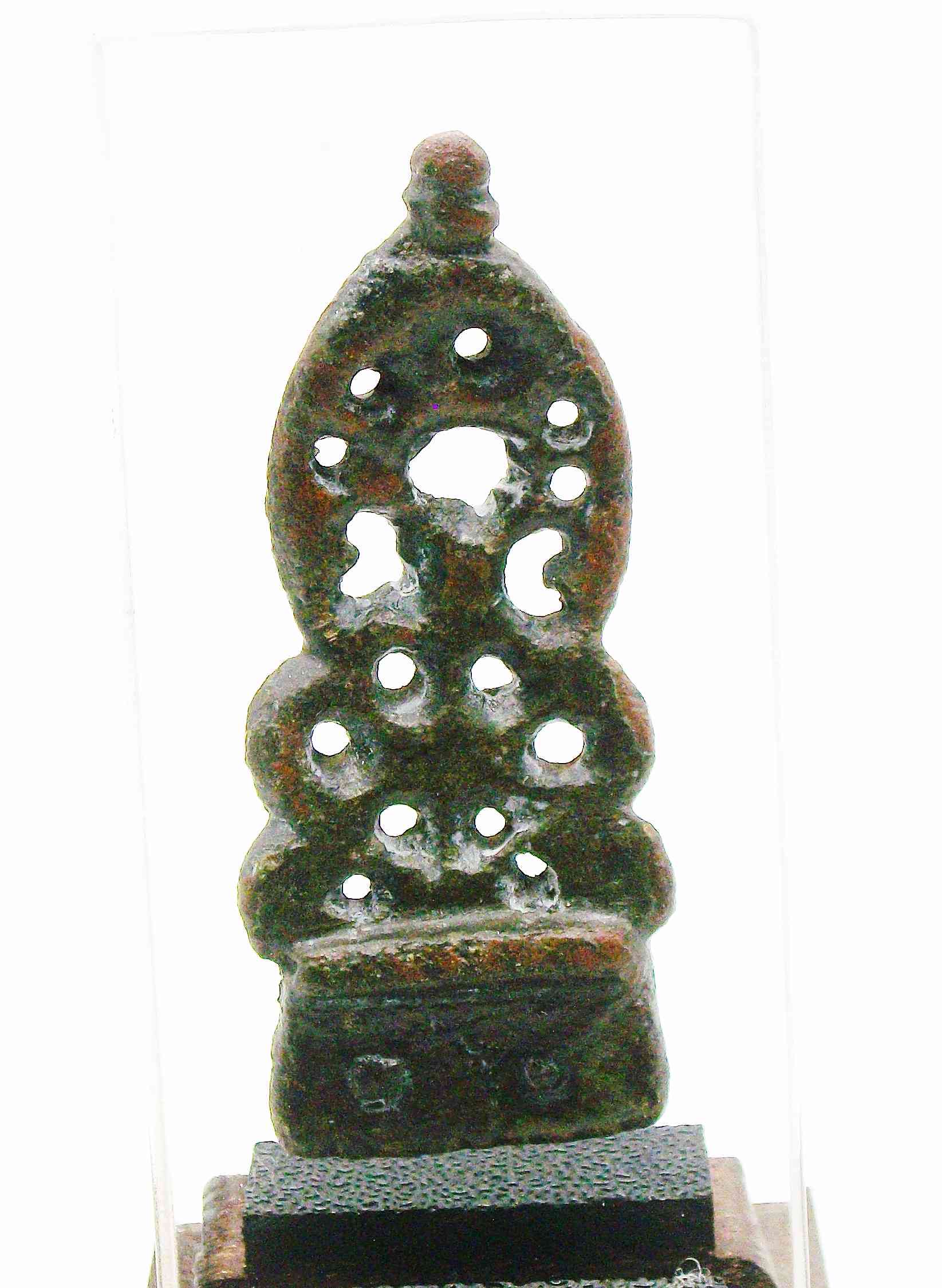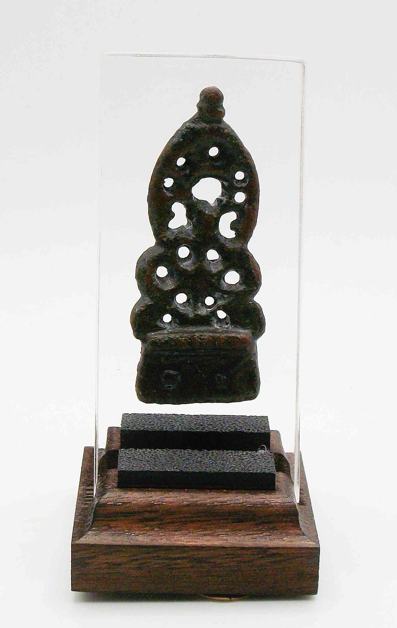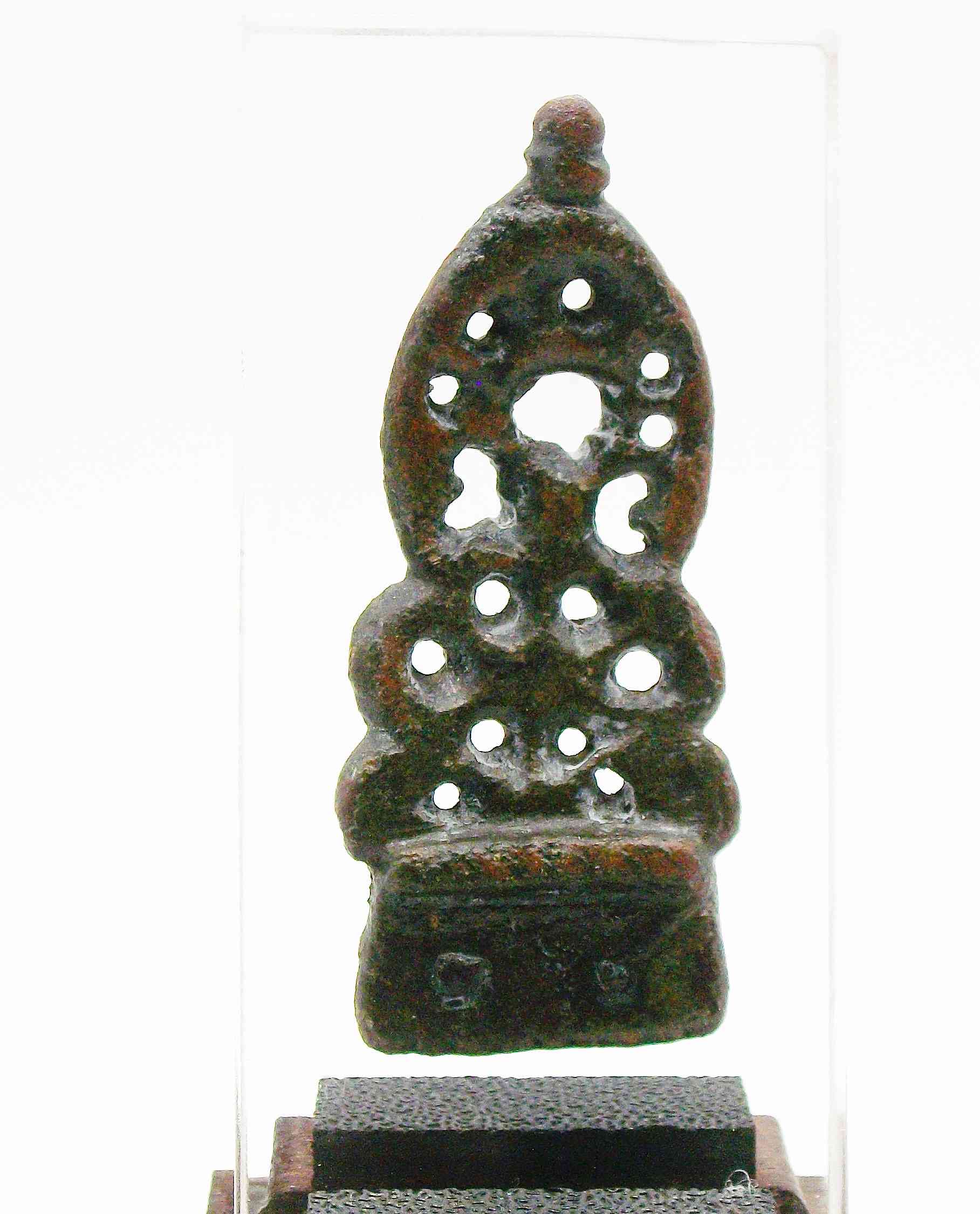 Late Anglo-Saxon bronze strap end. Triangular in shape with waisted open work profile. Coiled tendril decoration with knot finial. Remains of two studs to oblong section of object. Presented on a custom made stand.