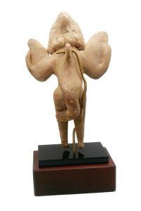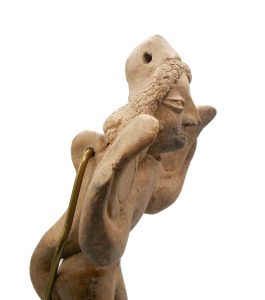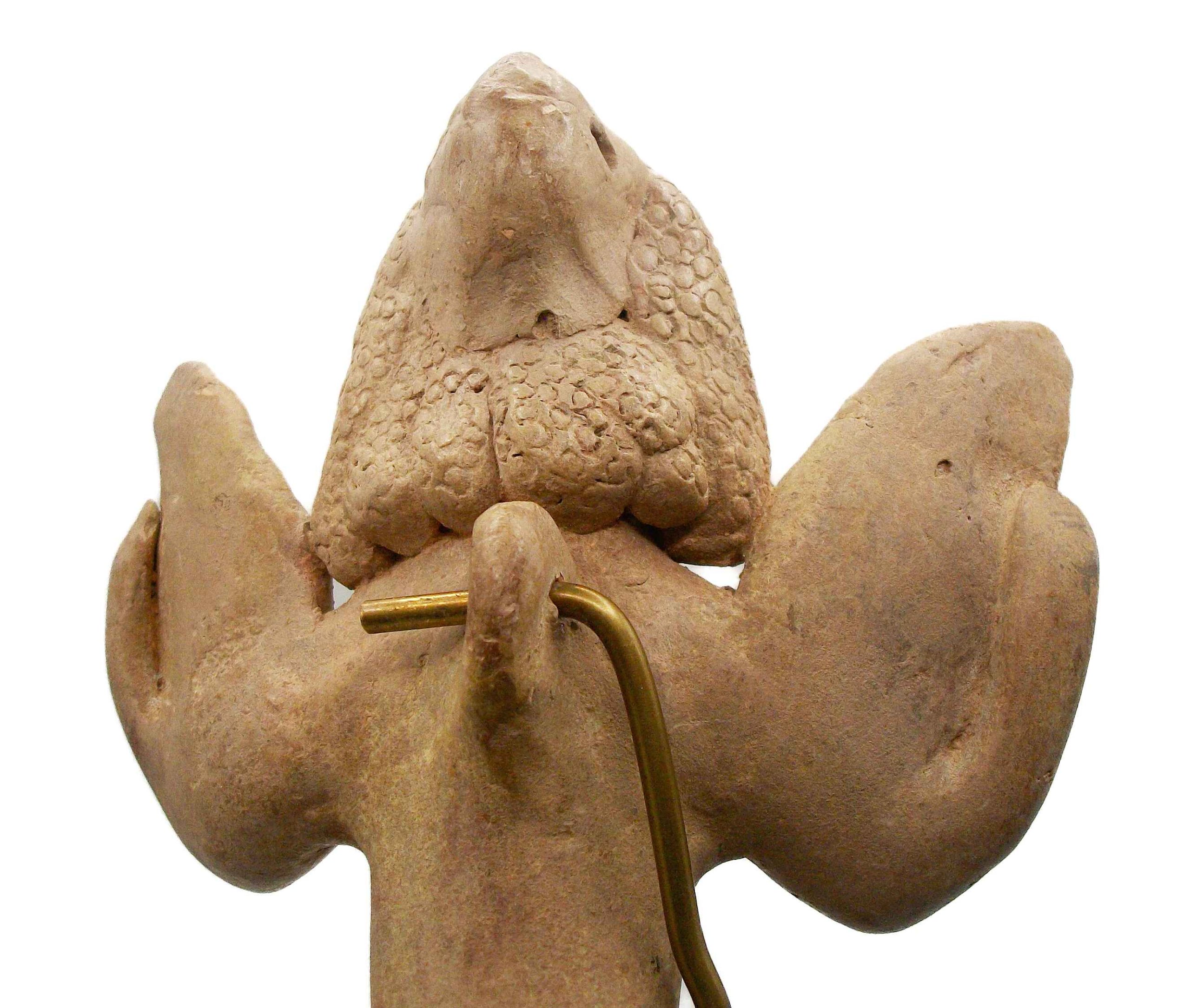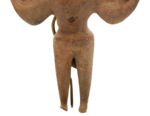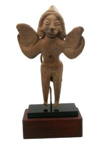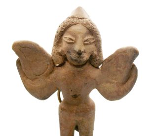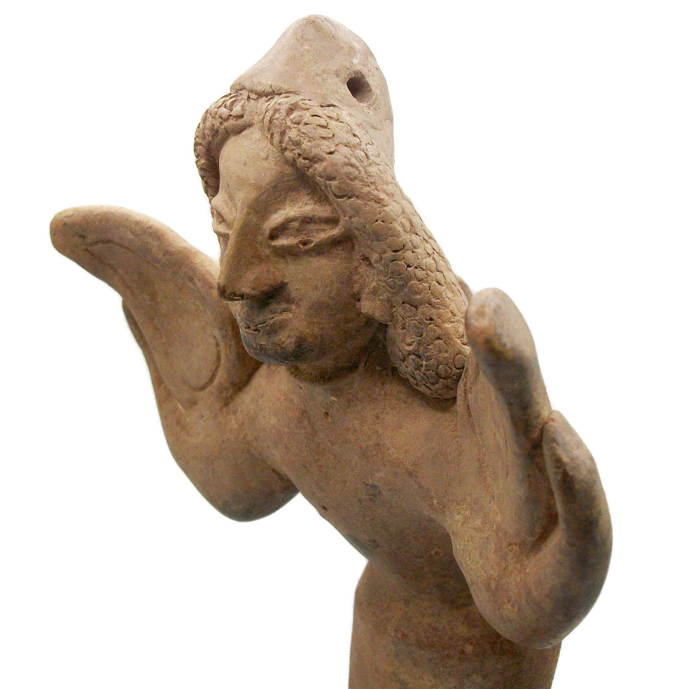 Terracotta winged figure of a man with detailed facial features including detailing to eyes and eye lids, prominent nose and a smiling mouth. Great detailing to long shoulder length hair displaying curls and wearing a small cloth cap. long thick tail to rear of figure with end section lost in antiquity.
