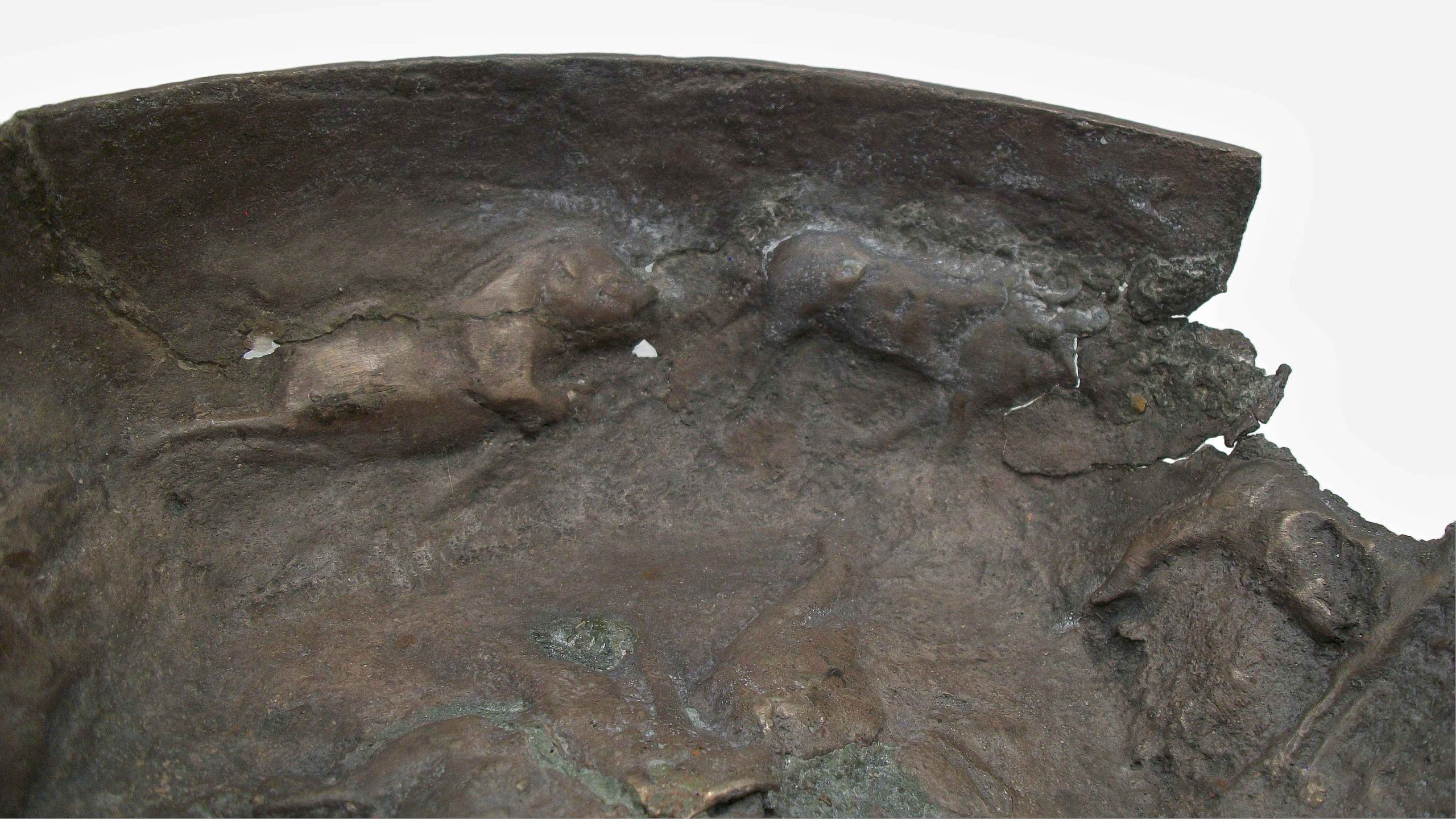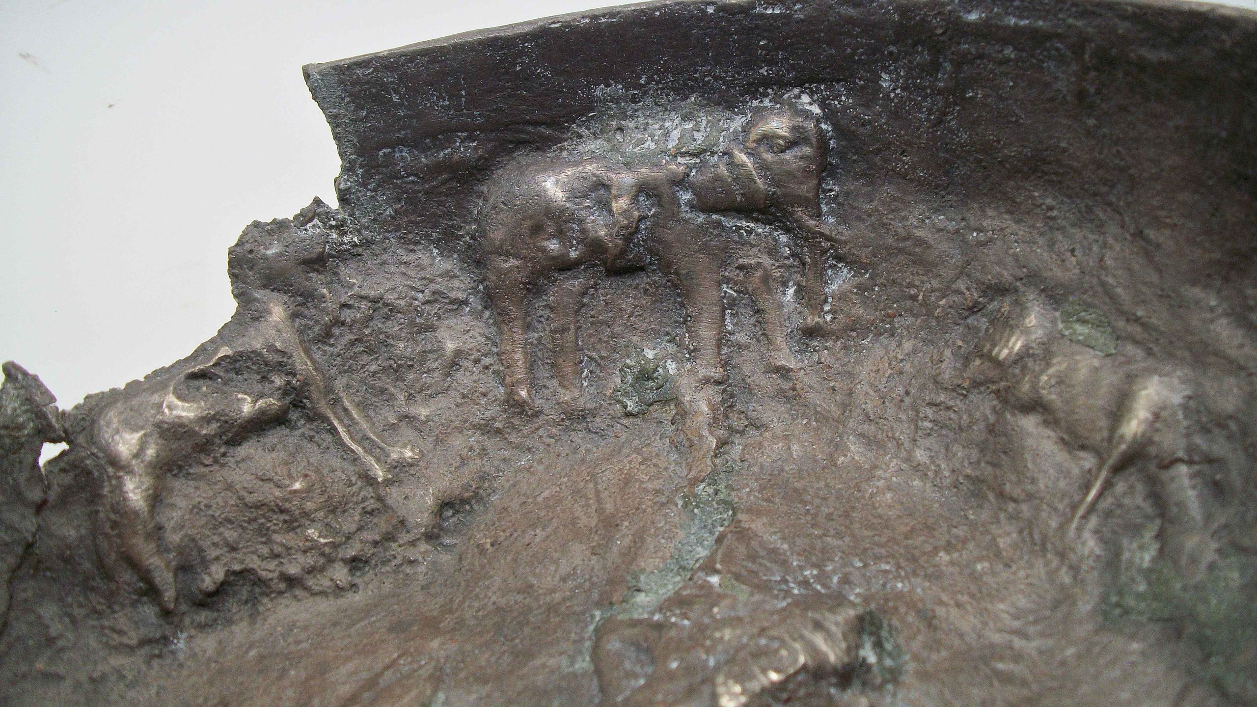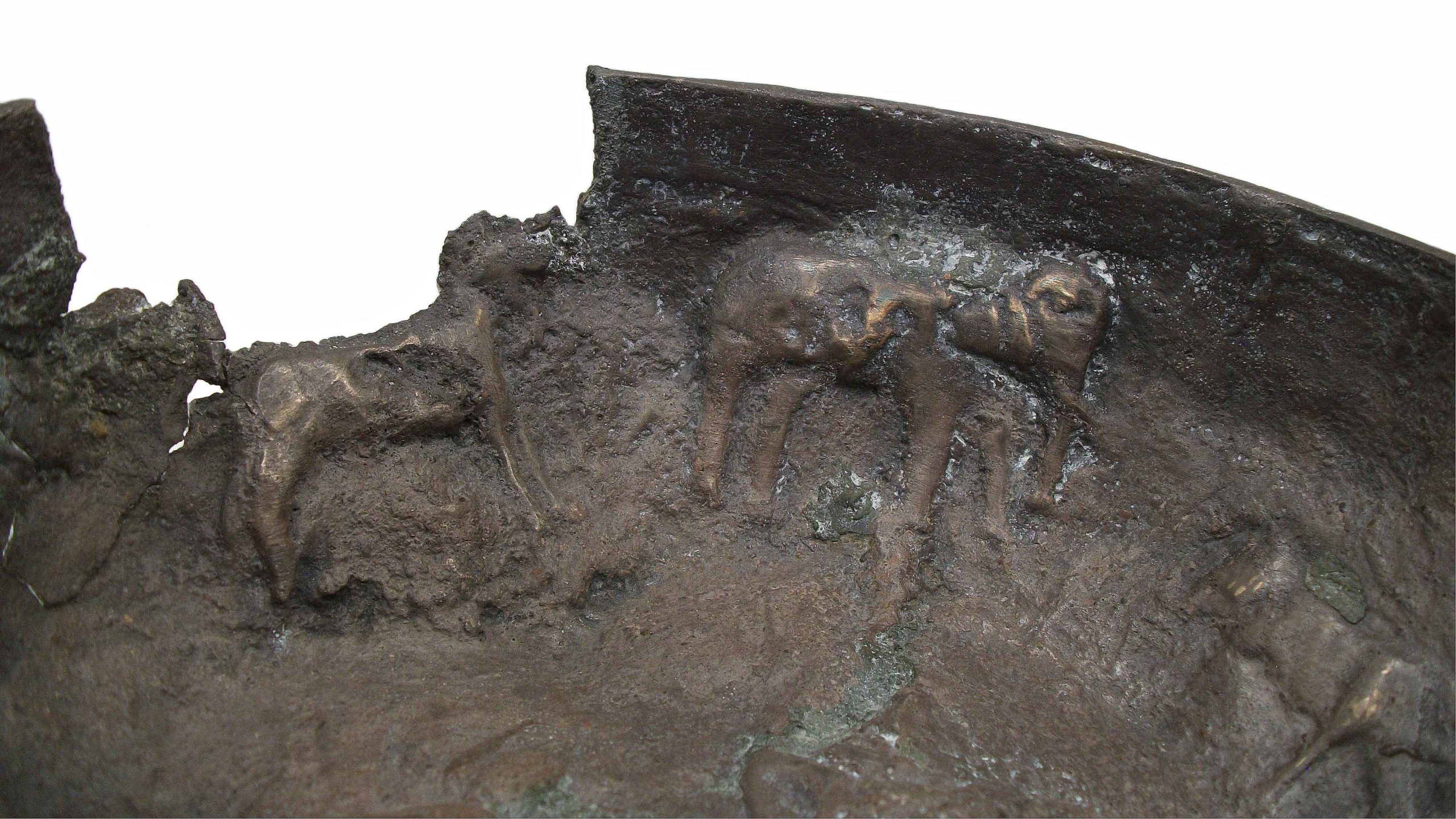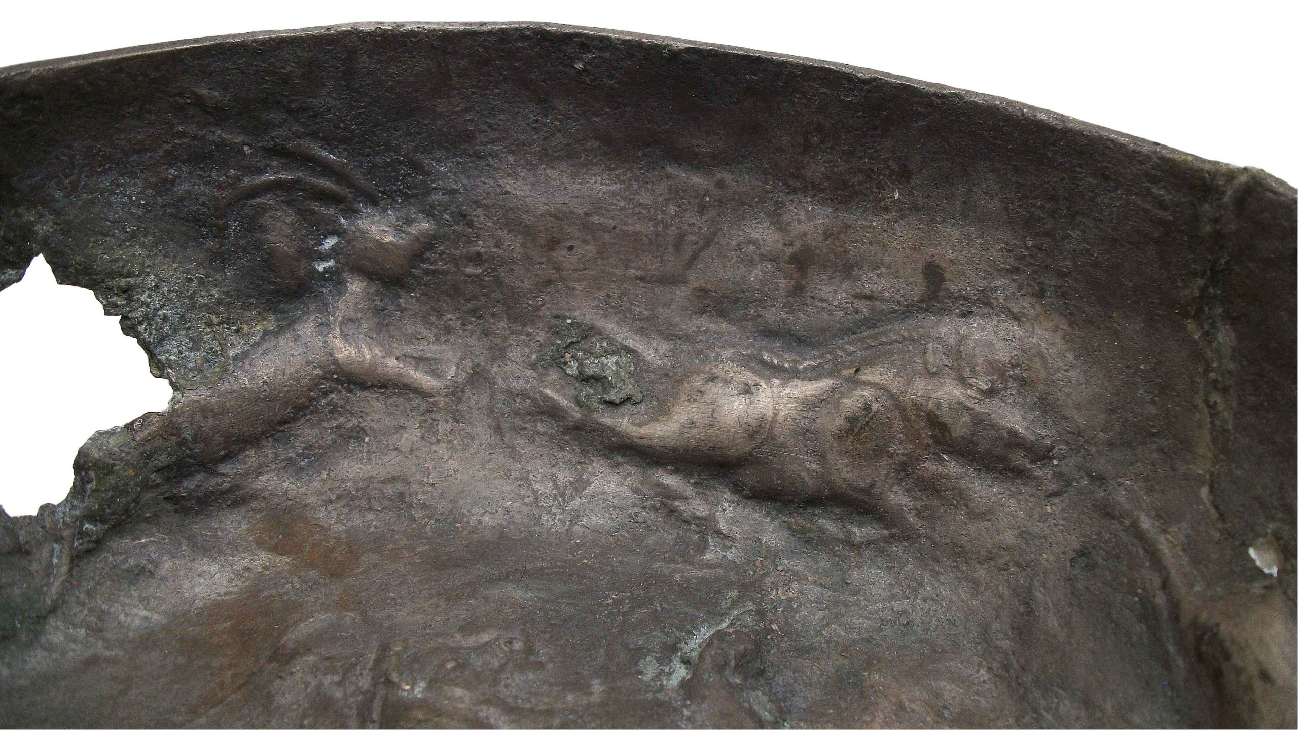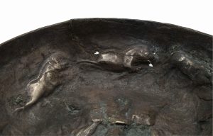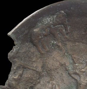 Sassanian repousse silver bowl with central inner figure of an archer on a horse. A register of animals to the inner edge featuring wild boar, elephant and ibex. cf – The Met object No. 34:33 for similar.