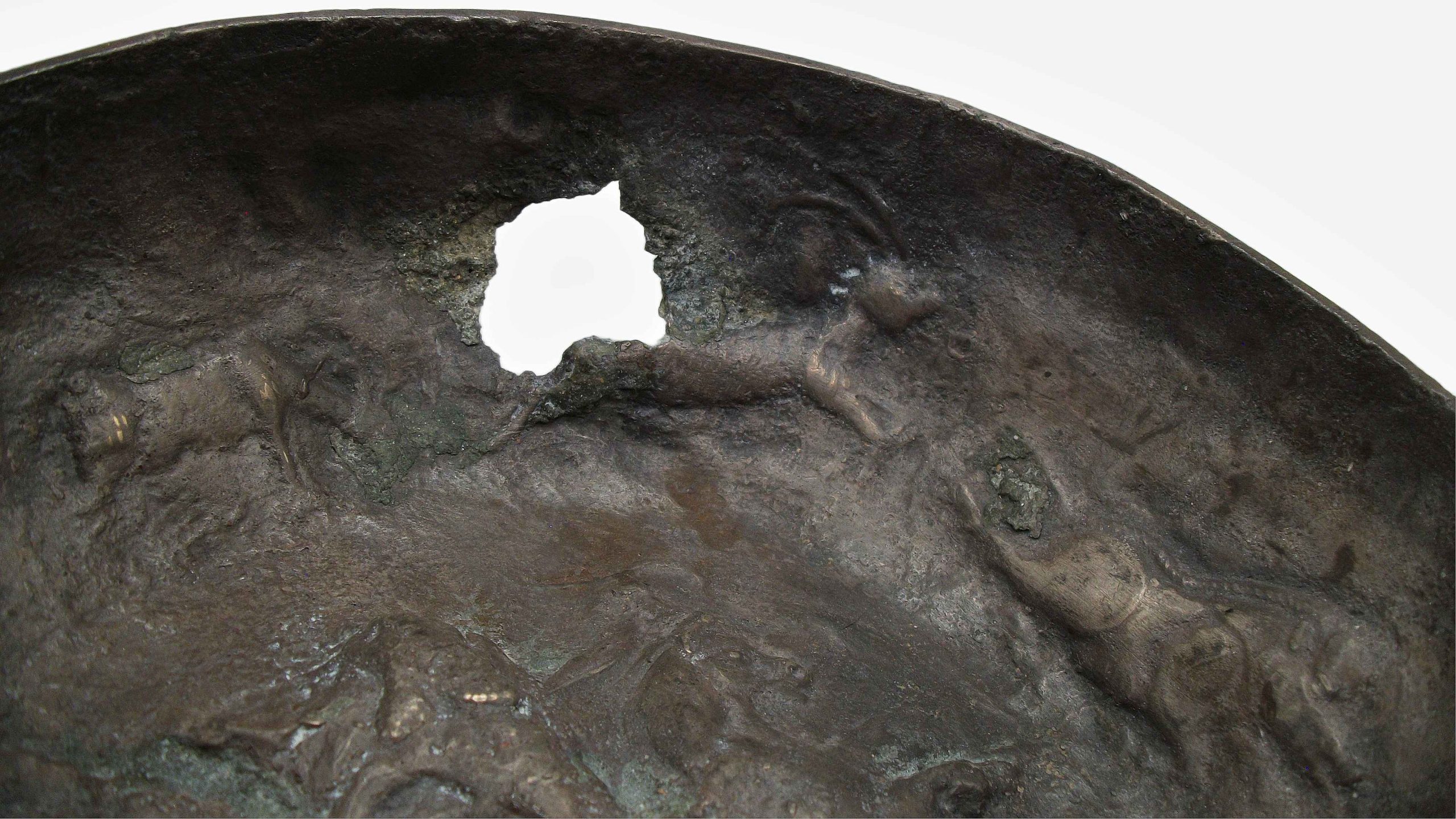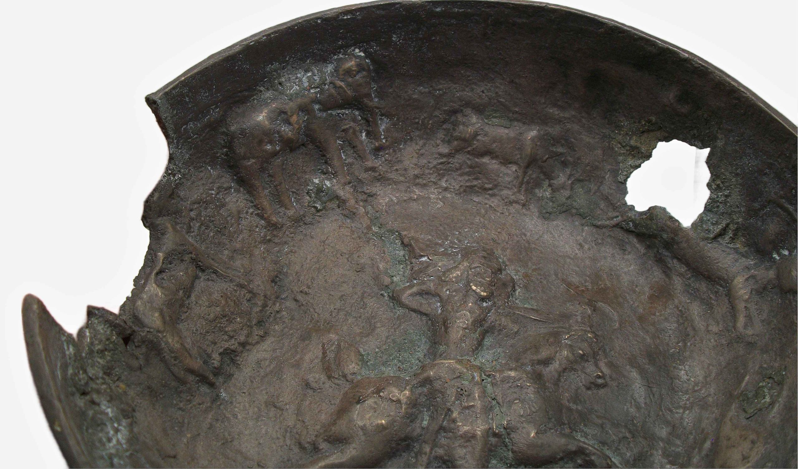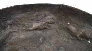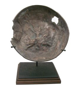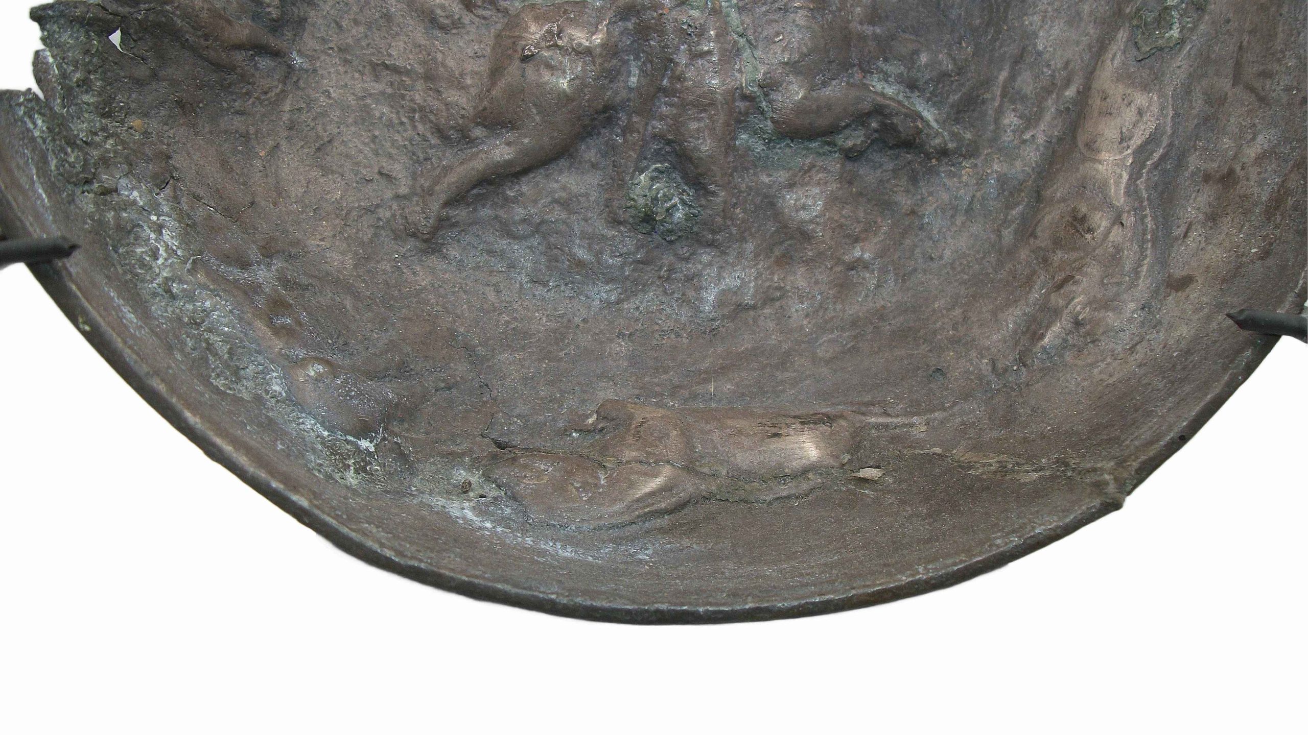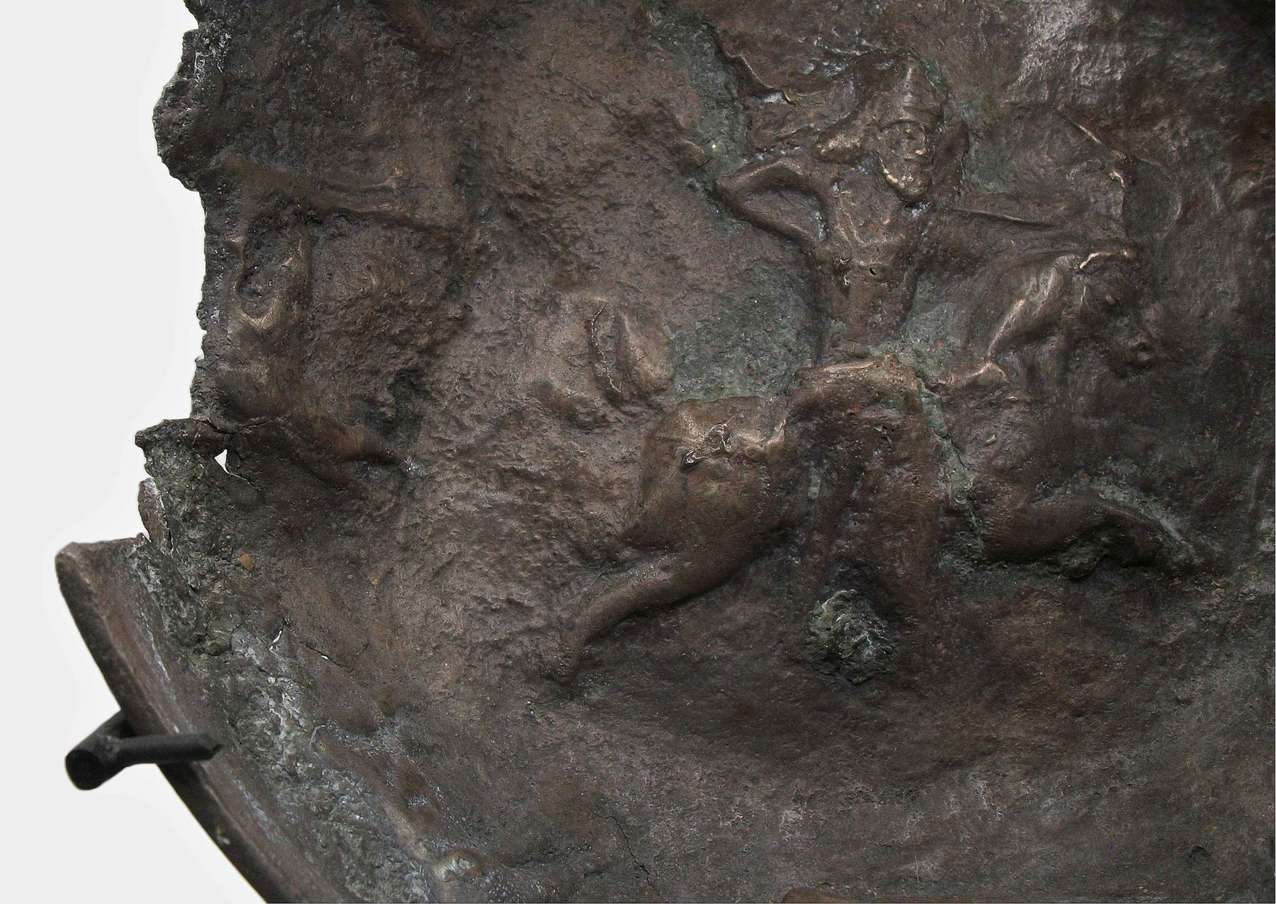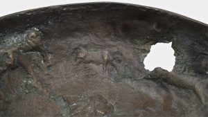 Sassanian repousse silver bowl with central inner figure of an archer on a horse. A register of animals to the inner edge featuring wild boar, elephant and ibex. cf – The Met object No. 34:33 for similar.