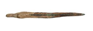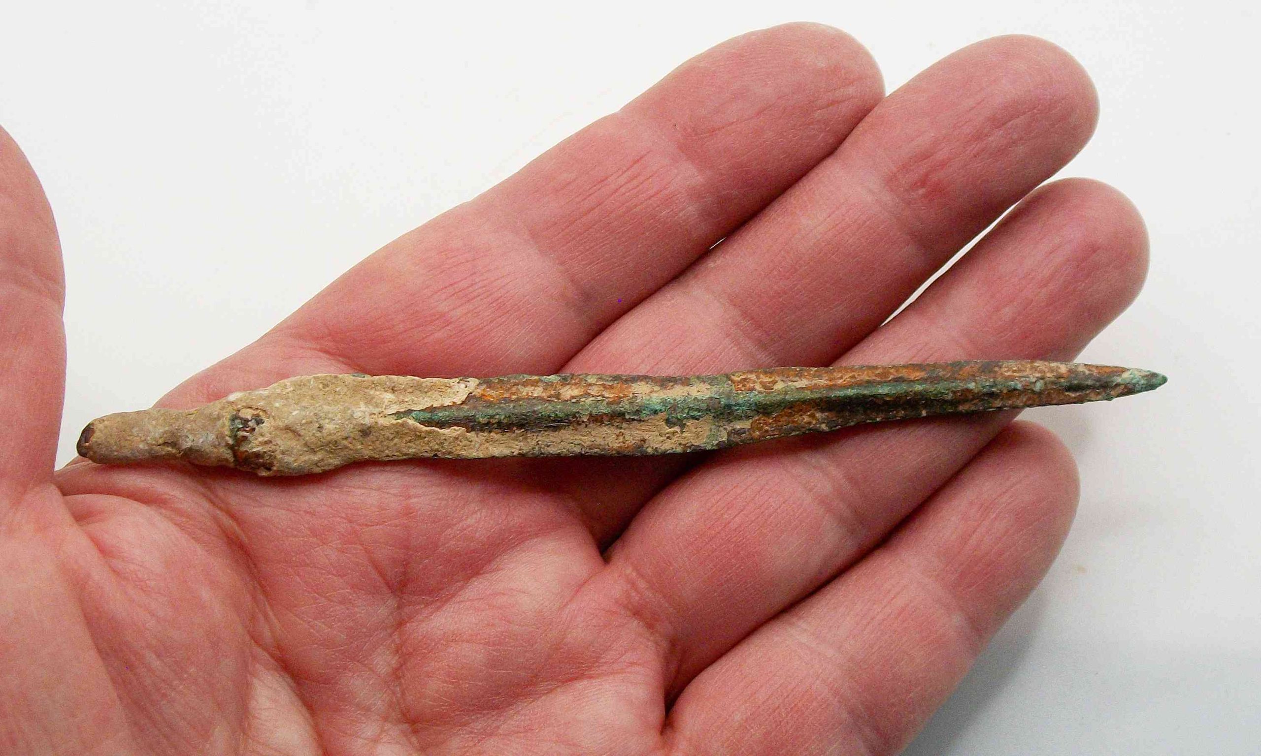 Distressed ancient condition with significant losses to edges of arrow blade and a Verdigris patina. Presented on a custom made stand.